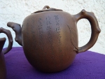 Service à thé en terre de YIXING.Composé de 4 bols,theière,pot à lait et sucrier.Recouverts d'ideogrammes qui représentent des poèmes. Parfait état. VENDU