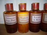 Série de 7 flacons de pharmacie avec bouchons en tôle litho en verre soufflé. Vendus en série ou à la pièce. Ht 22 cms reste 6 flacons